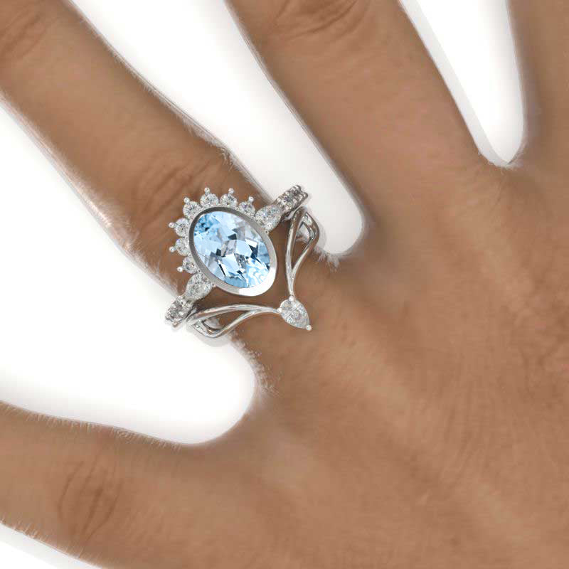 3 Carat Oval Genuine Natural Aquamarine Bezel Set Engagement Ring Eternity Ring Set