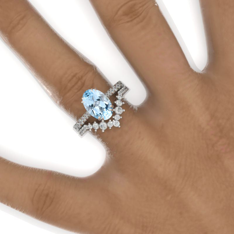 3 Carat Oval Genuine Natural Aquamarine Solitaire Set Engagement Ring V Eternity Ring Set