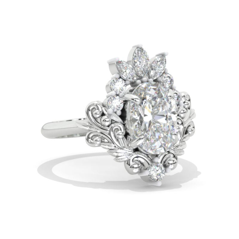 Approximately 3+ Carat LAB-Grown Diamond Oval 10x7mm D-Colorless, VVS1-Clarity, VG-Cut, Ex-Polish, VG-Symmetry Center Stone with 16 Colorless 0.8 CTW LAB-Grown Diamond (D-Colorless VVS1-Clarity) Accent Stones 14K White Gold Ring.