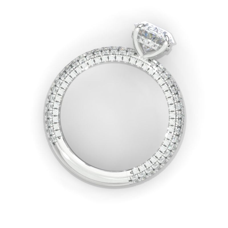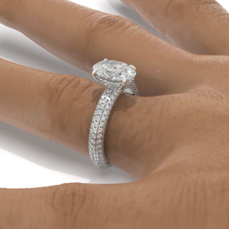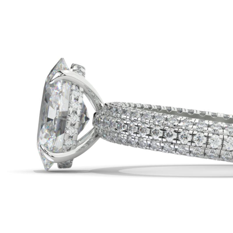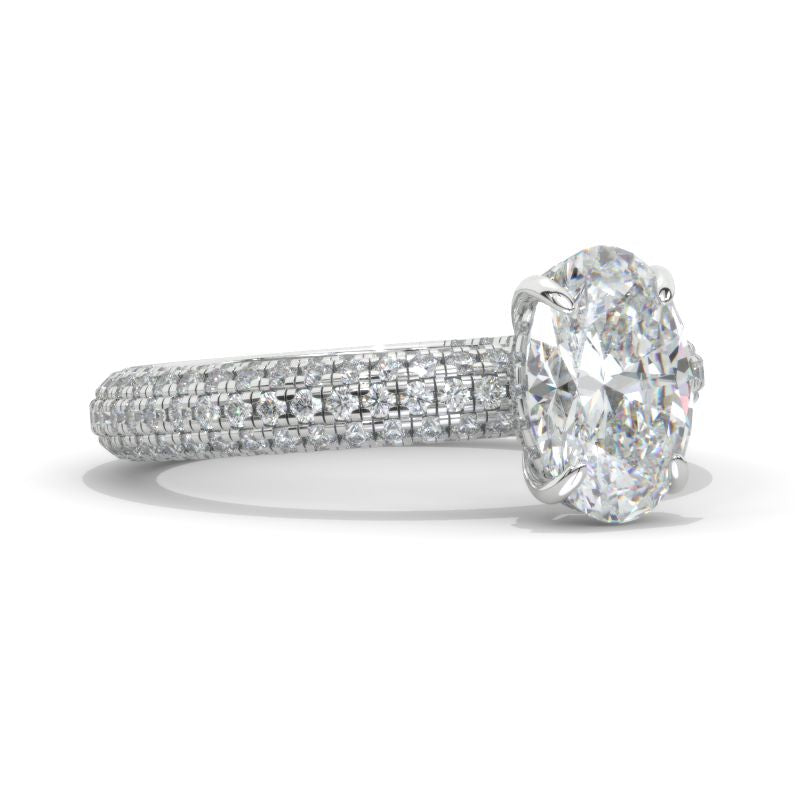 3 Carat Moissanite 10x7mm Oval Center Stone D-Colorless, VVS1-Clarity, Ex-Cut, Ex-Polish, VG-Symmetry with 0.95 CTW Moissanite (D-Colorless, VVS1 clarity) French-Set Accent Stones 14K White Gold Ring.