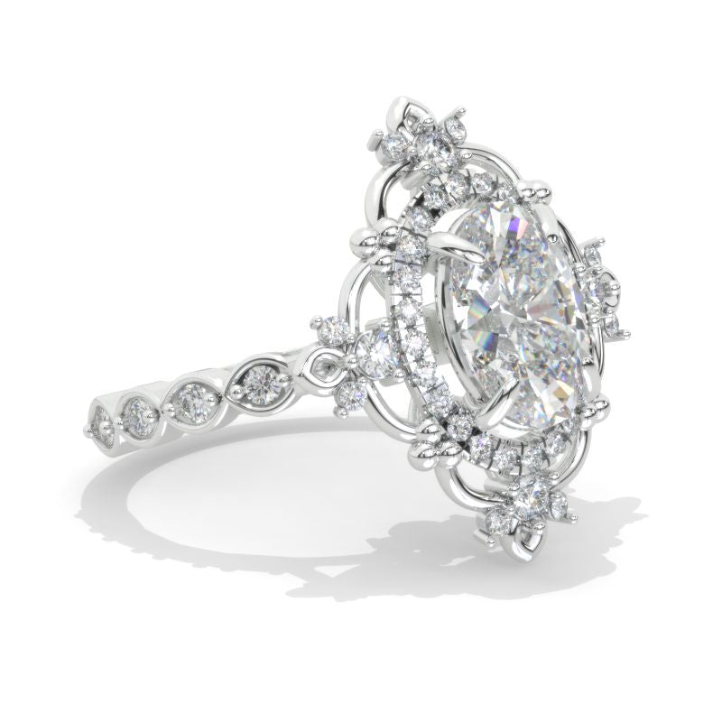 Engagement Ring Approximately 3 Carat Giliarto Moissanite 8x6mm Oval D- Colorless, VVS1-Clarity, VG-Cut, Ex-Polish, VG-Symmetry Center Stone set with D- Colorless Moissanite Accent Stones inÂ