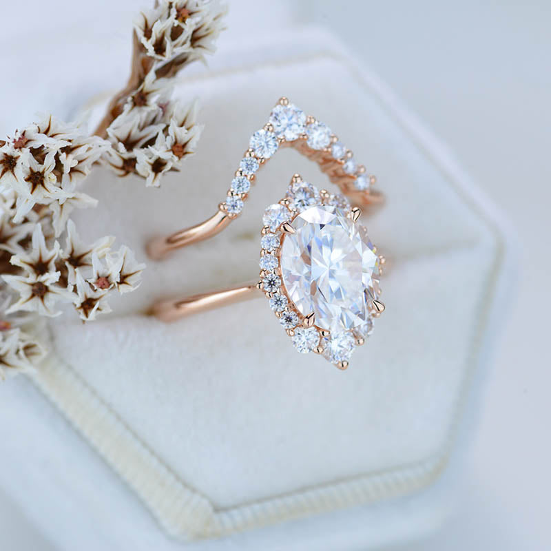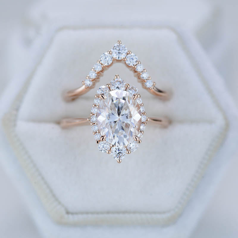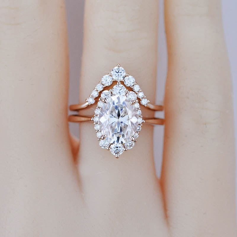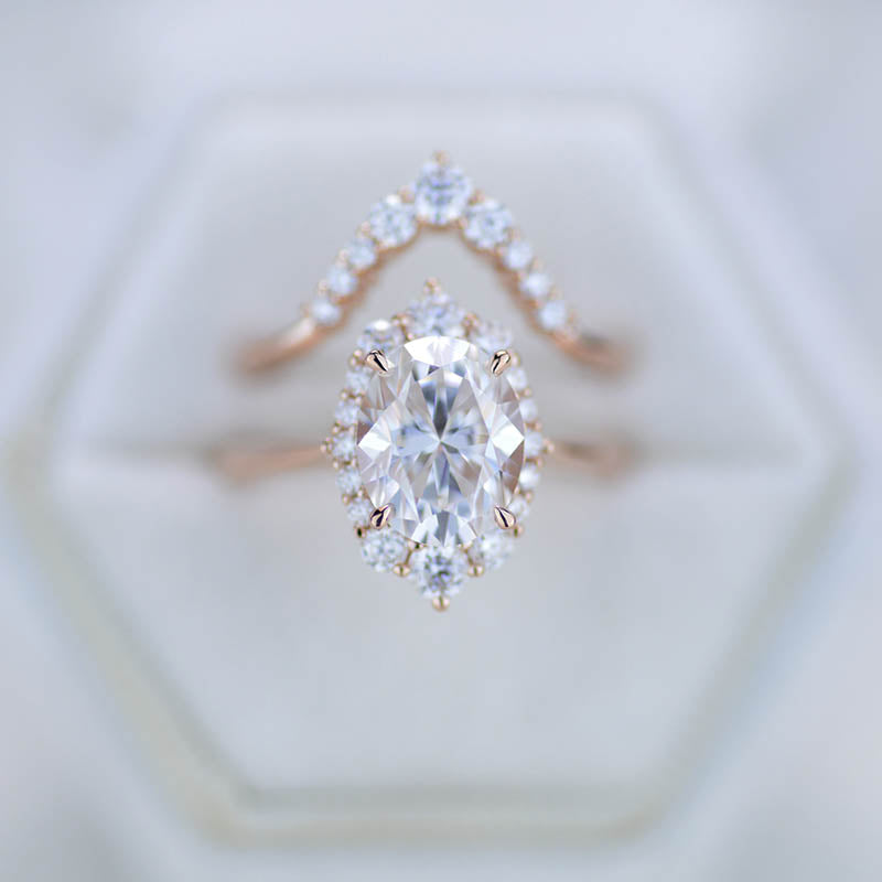 The default design option features 10x8 mm Oval Halo Round Cut Moissanite Stone