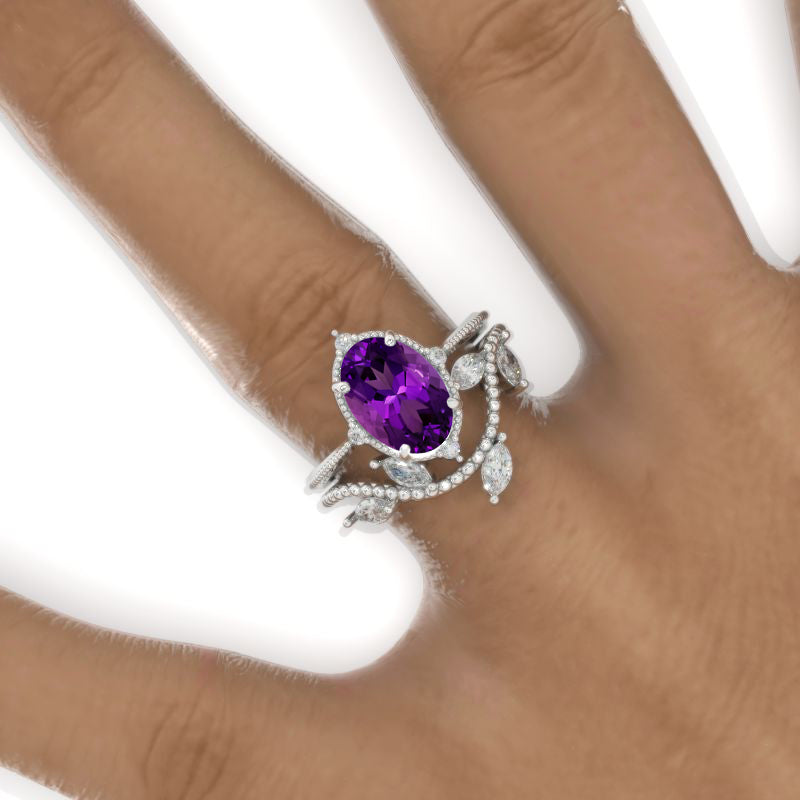 Engagement : 3 Carat Genuine Natural Amethyst- AAAA Grade Oval10x8mm VG-Cut, Ex-Polish, VG-Symmetry Center Stone set with D- Colorless Moissanite Accent Stones in 14K White Gold Ring.