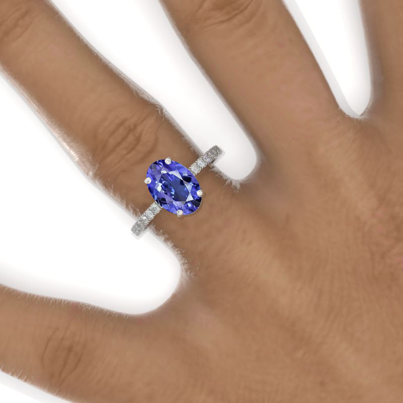 The default design option features 10x7mm Oval Cut Natural Genuine Tanzanite and Accent Stones, VG-Cut, Ex-Polish, VG-Symmetry, Set with Colorless Moissanite Accent stones in 14K White Gold Engagement Ring.