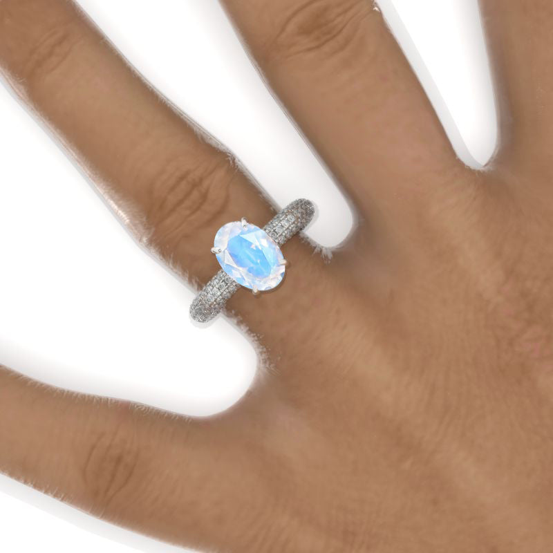 3 Carat Genuine Natural Moonstone 10x7mm Oval Center Stone Ex-Cut, Ex-Polish, VG-Symmetry with 0.95 CTW Moissanite (D-Colorless, VVS1 clarity) French-Set Accent Stones 14K White  Gold  Ring.