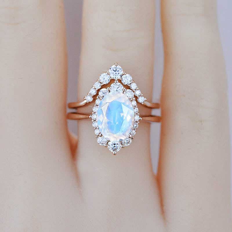3 Carat Oval Natural Moonstone Halo Engagement Ring, Promise Ring For Her, Natural Moonstone Wedding Ring, 14K Gold Oval Natural Moonstone Engagement Ring Set