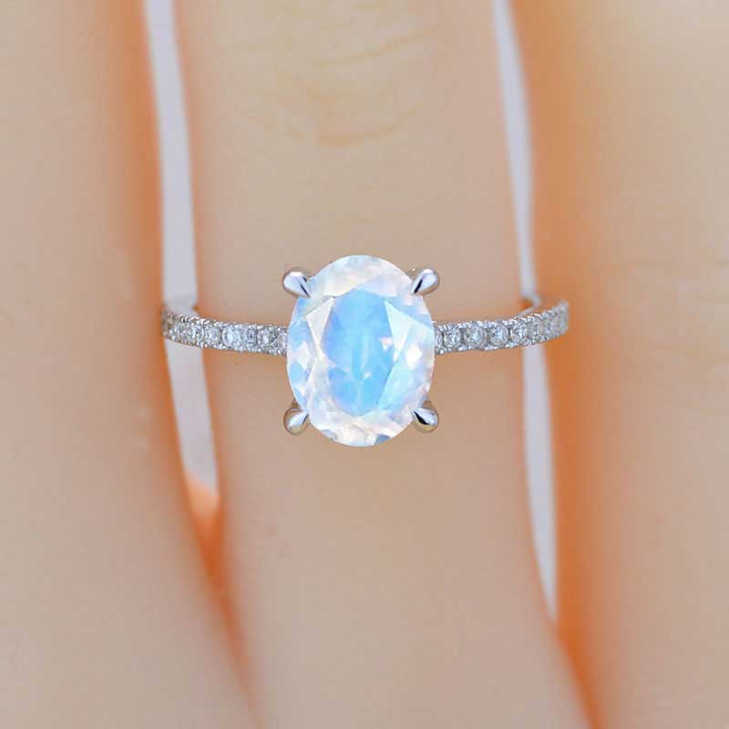 3 Carat Oval Natural Moonstone Ring, Hidden Halo Gold Engagement Ring
