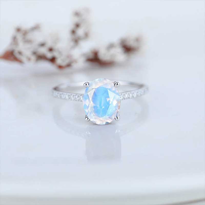 3 Carat Oval Natural Moonstone Ring, Hidden Halo Rose Gold Engagement Ring