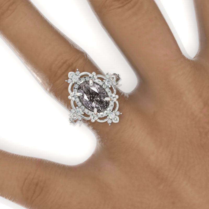 3 Carat Oval Natural Rutilated Quartz Halo Engagement Ring 14K White Gold Ring