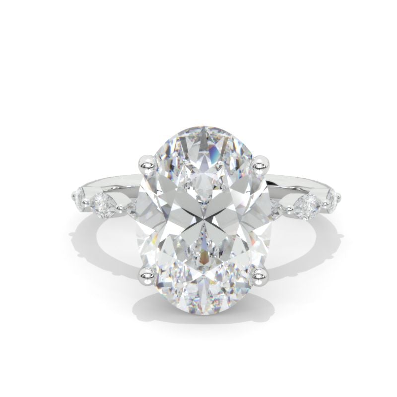 The default design option features 3 Carat Oval Cut 10x8mm Giliarto Moissanite Center Stone D-Colorless, VVS1-Clarity, VG-Cut, Ex-Polish, VG-Symmetry