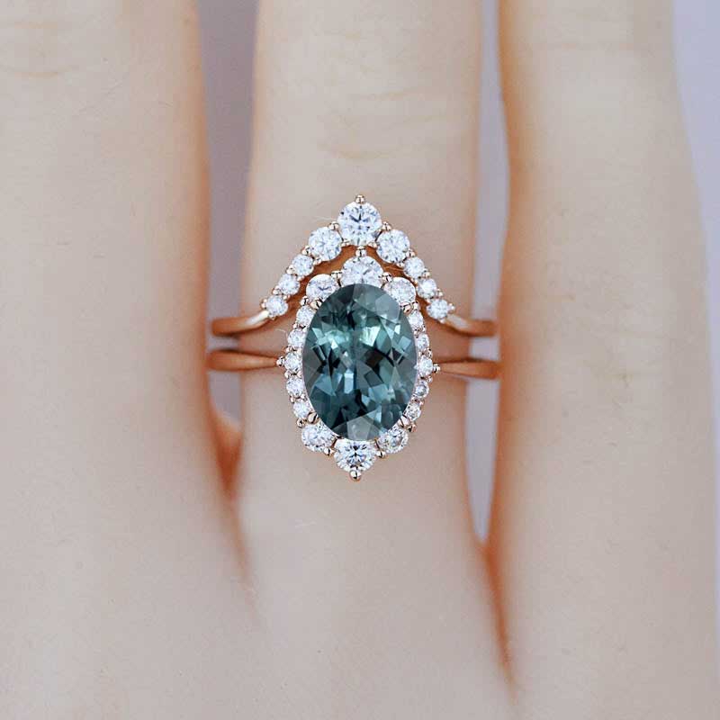The default design option features 10x8mm Oval Ethically Lab-Grown Teal Sapphire Stone, VVS1-Clarity, VG-Cut, Ex-Polish, VG-Symmetry Set with D- Colorless Moissanite Accents Stones in 14K White Gold Engagement Ring.