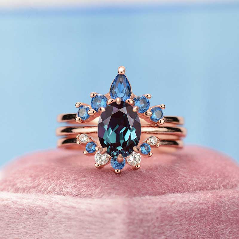 Vintage Design 3 Carat Oval Cut Ethically Lab-Grown Alexandrite Ring- Three Ring Set.