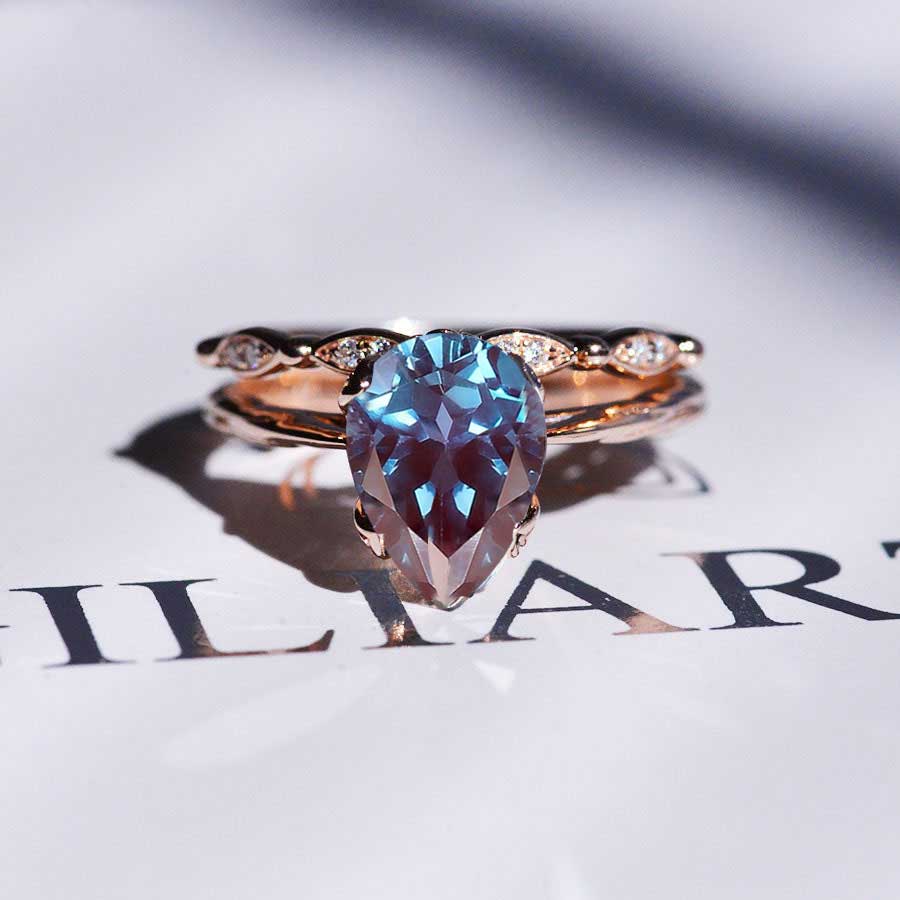 3 Carat Pear Alexandrite 14K Rose Gold Engagement. Eternity Ring. Set - Giliarto