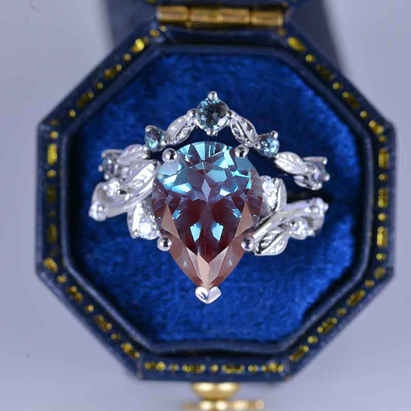 3 Carat Pear Alexandrite Halo Floral Engagement Ring 14K White Gold Ring Set