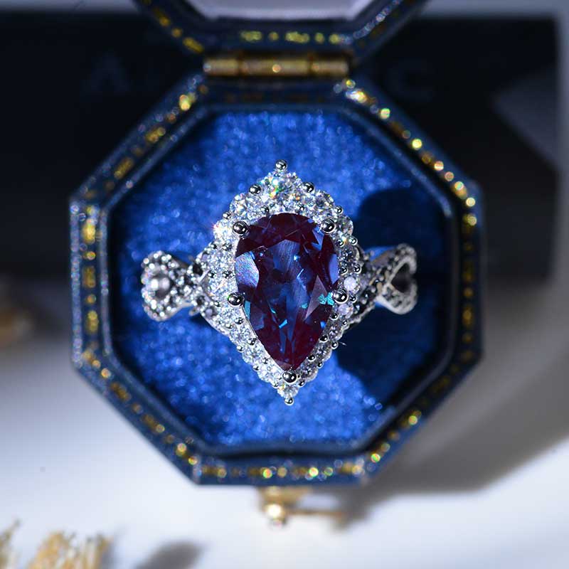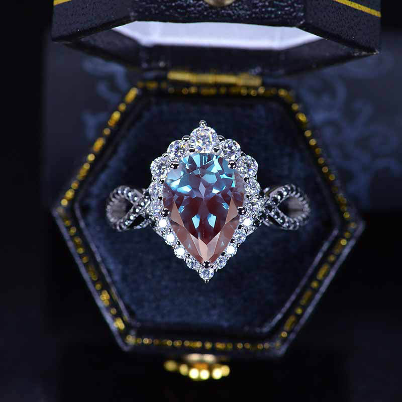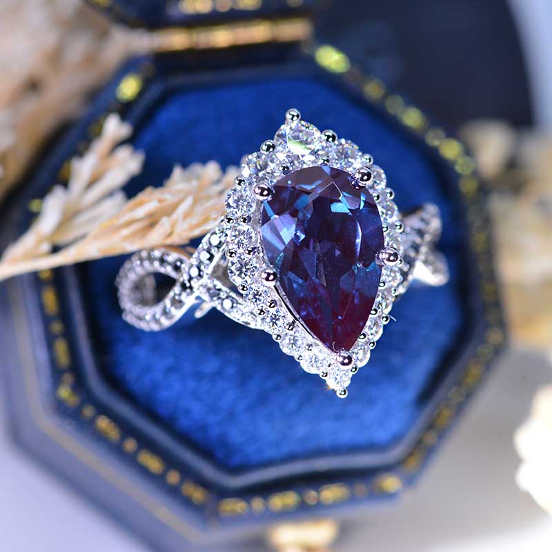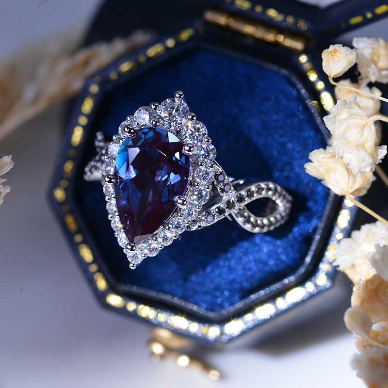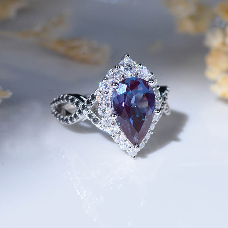 Engagement Ring: 3 Carat Ethically LAB-Grown Alexandrite Pear 11x7mm  VVS1-Clarity, VG-Cut, Ex-Polish, VG-Symmetry Center Stone with 124 Black Moissanites