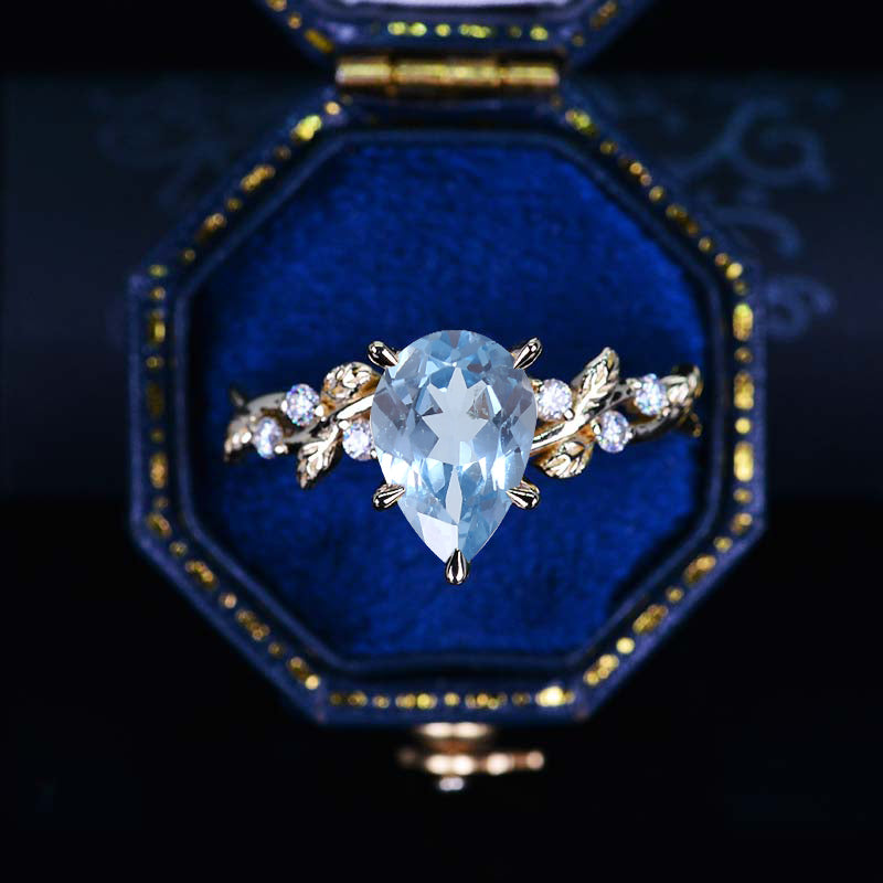 3 Carat Pear Brilliant Cut Genuine Natural Aquamarine Floral 14K Yello - Giliarto