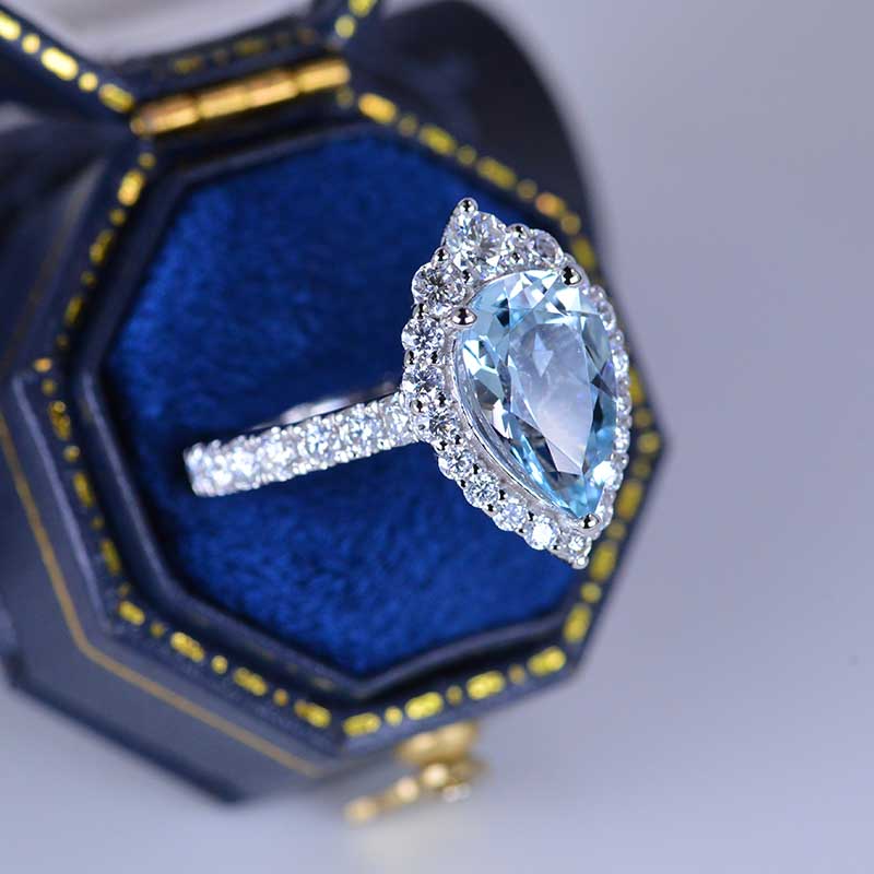 The default design option features 3 Carat 11x7mm Pear Cur Genuine Aquamarine Center Stone, VG-Cut, Ex-Polish, VG-Symmetry