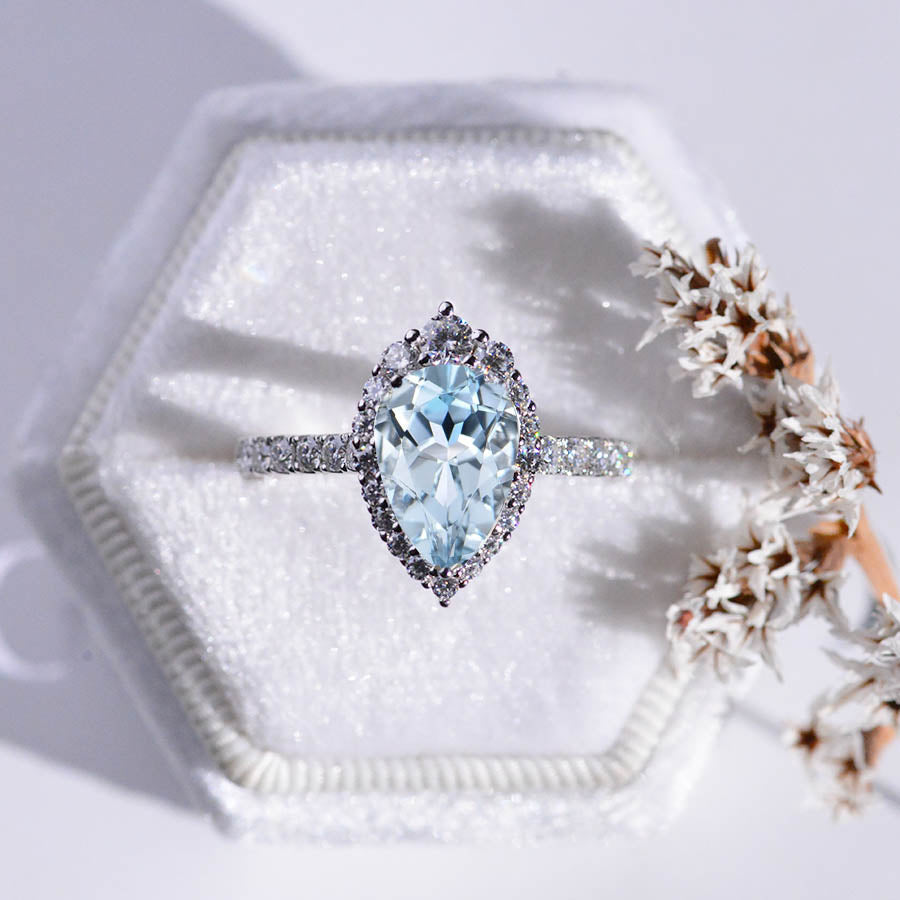 3 Carat Pear Cut Aquamarine Halo Moissanite 14K White Gold Ring