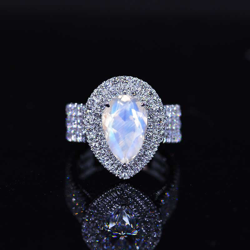 The default design option features approximately 3 Carat Genuine Moonstone Pear 11x7mm VVS1-Clarity,VG-Cut,Ex-Polish, VG-Symmetry Center Stone