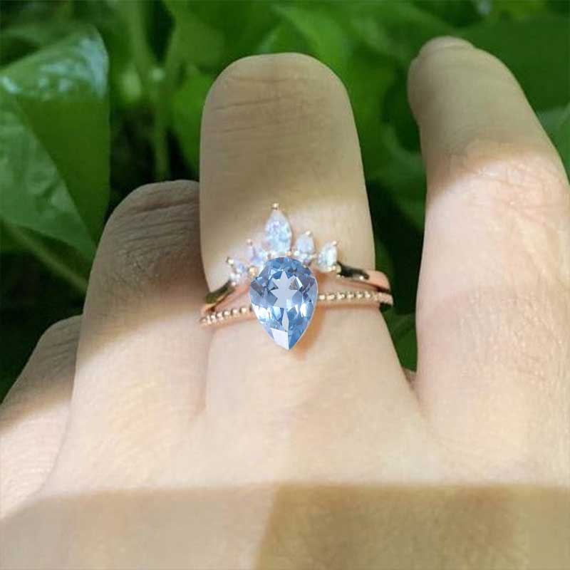3 Carat Pear Cut Genuine Natural Aquamarine White Gold Ring- Two Ring Set