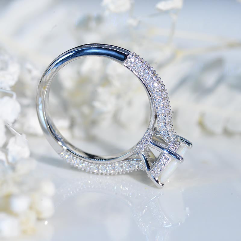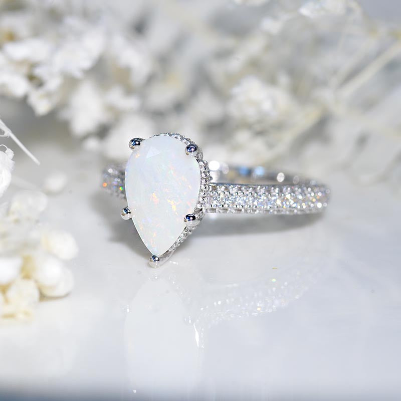 Center Stone: 3 Carat - 11x7mm Pear Cut Genuine White OpalĀ Side Stones: 118 pieces- Moissanite D-Colorless Clarity: VS1 Cut: Excellent set in Solid 14K White Gold The total approximate weight of side stones: 1.2CTW Shank width: 2.3mm
