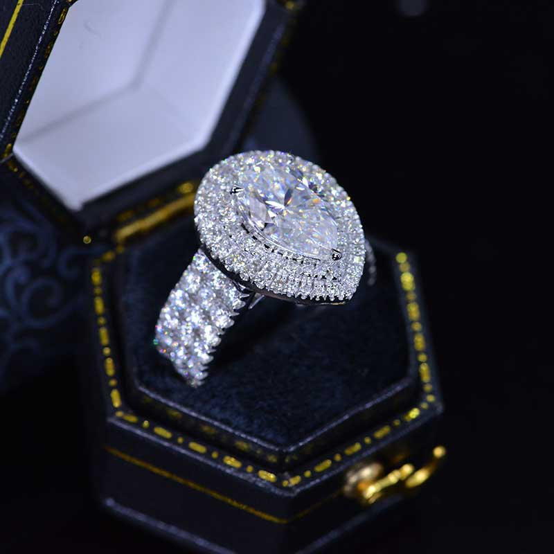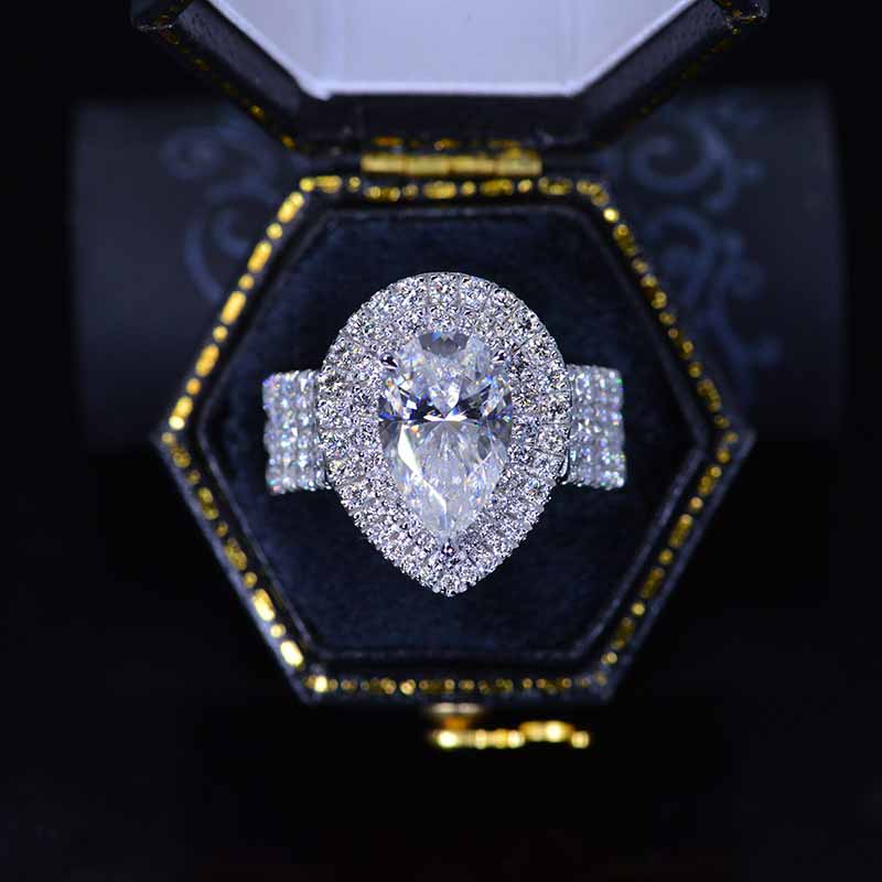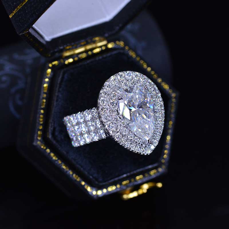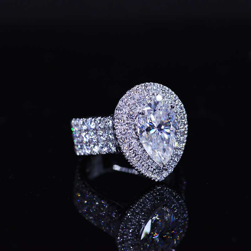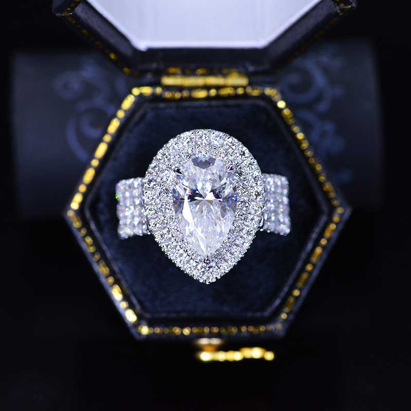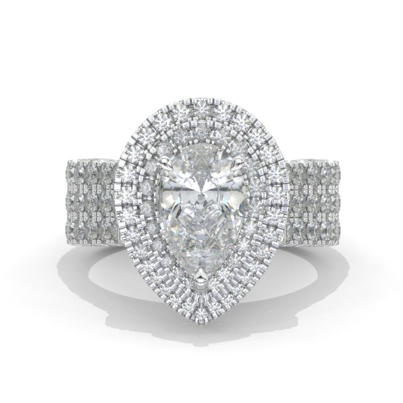 The default design option features approximately 3 Carat Giliarto Moissanite Pear 11x7mm D-Colorless, VVS1-Clarity,VG-Cut,Ex-Polish, VG-Symmetry Center Stone