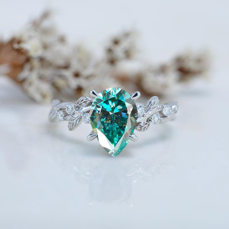 The default design option features 10x7mm Green Moissanite Pear Moissanite Center Stone, VVS1-Clarity, VG-Cut, Ex-Polish, VG-Symmetry