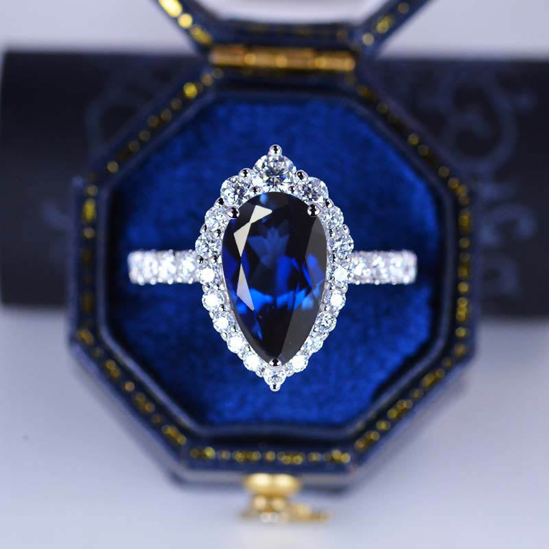 3 Carat Pear Cut Halo Blue Sapphire 14K White Gold Ring - Giliarto