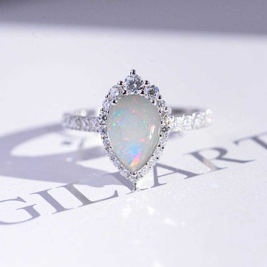 3 Carat Pear Cut Halo Genuine Genuine White Opal 14K White Gold Ring - Giliarto