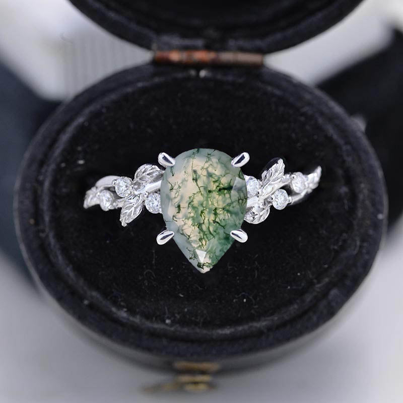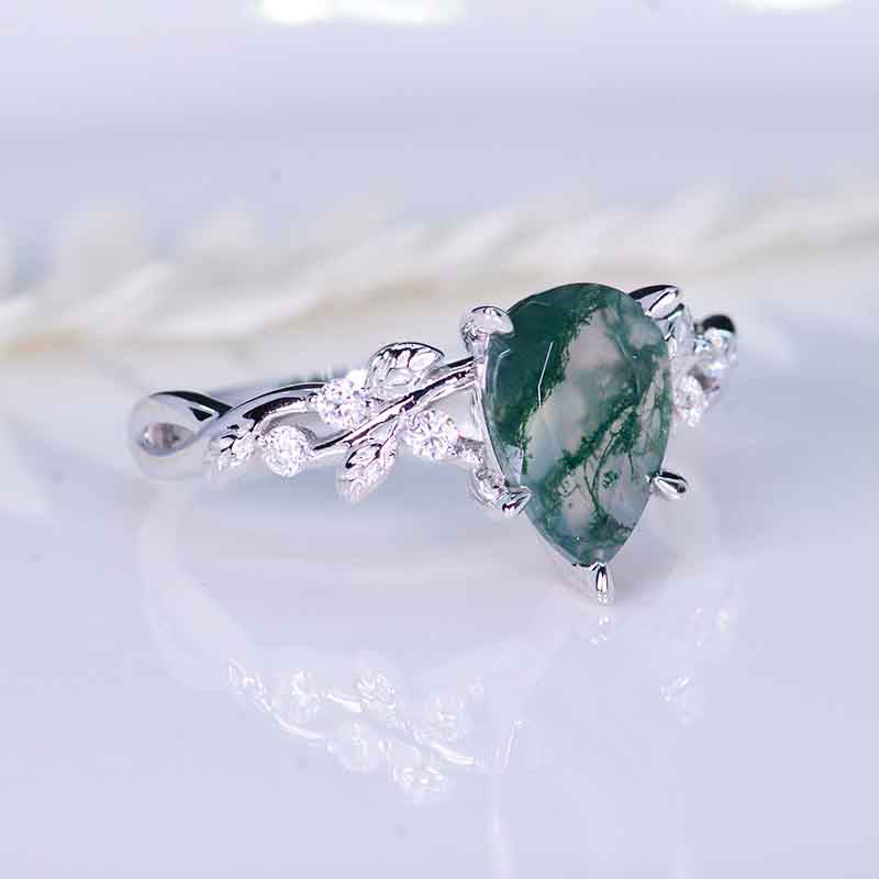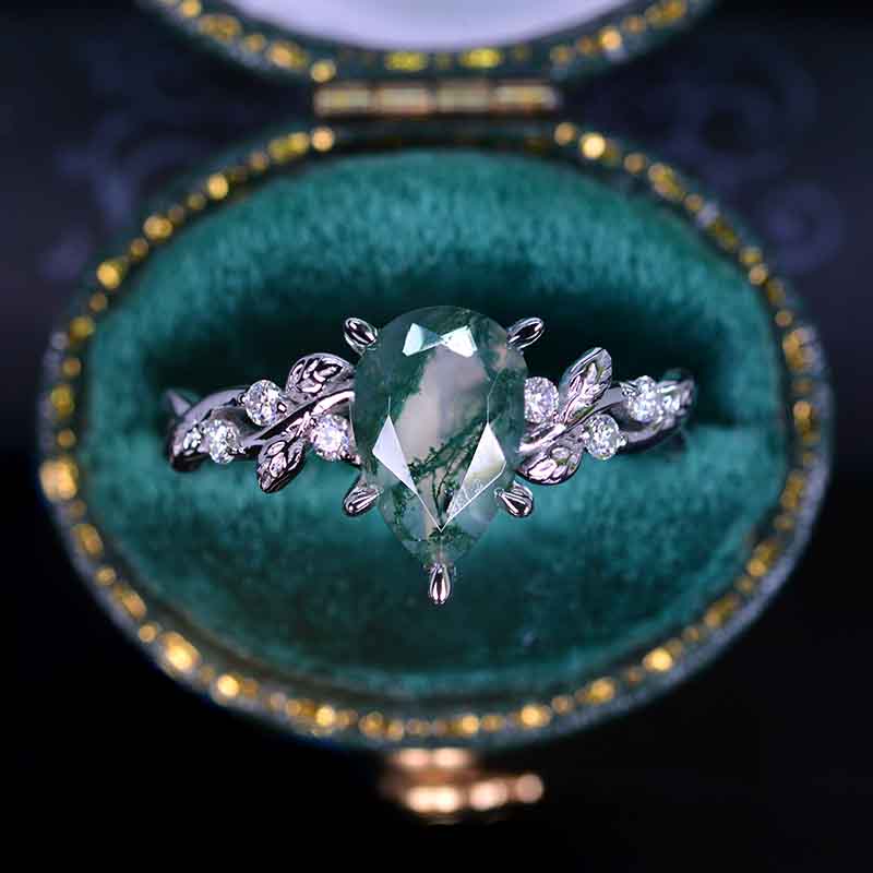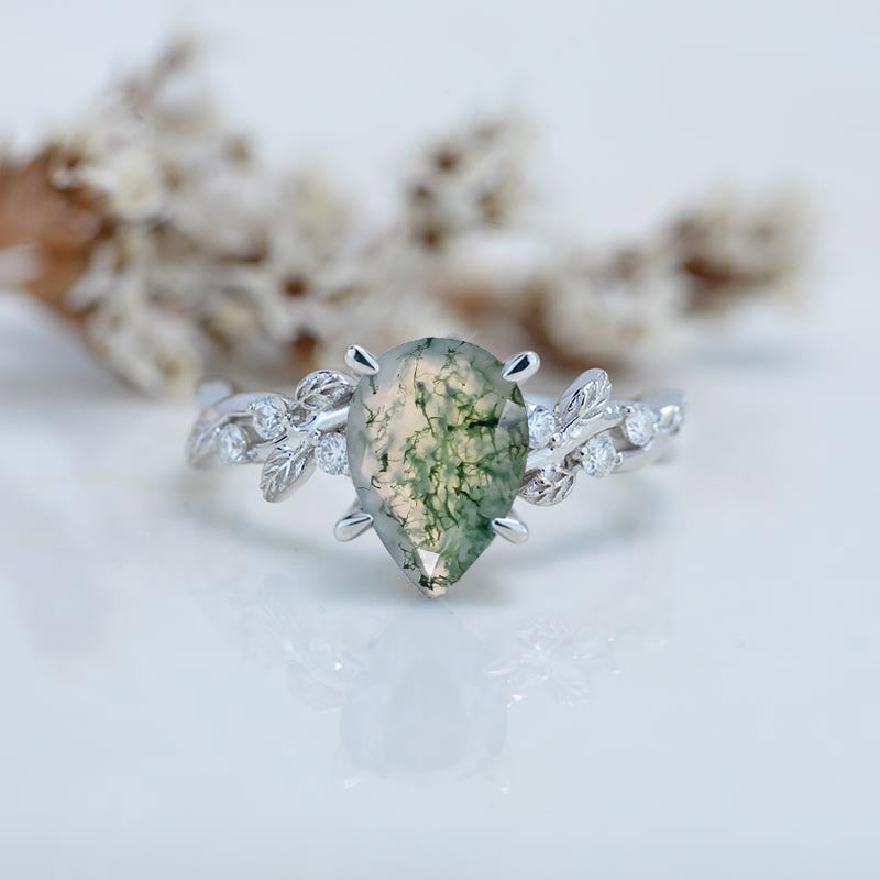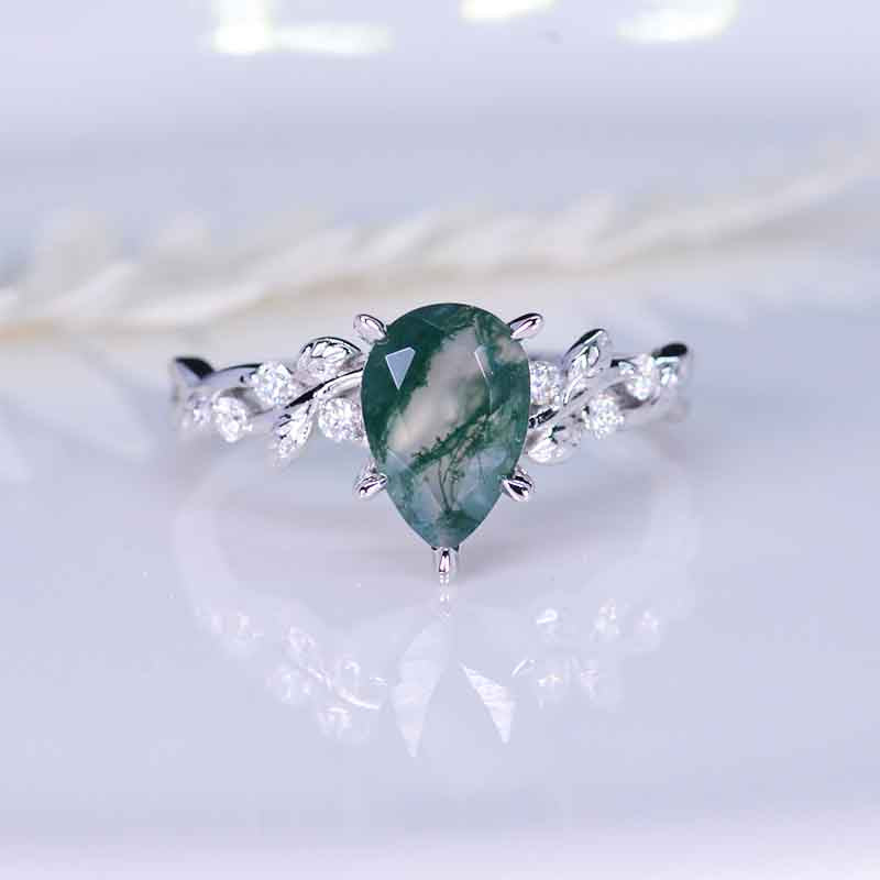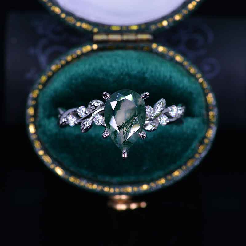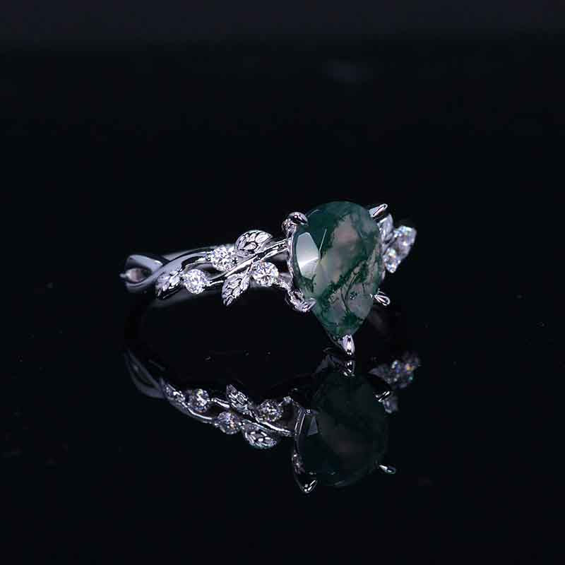 The default design option features 10x7mm Pear Genuine Moss Agate Center Stone,  VG-Cut, Ex-Polish, VG-Symmetry