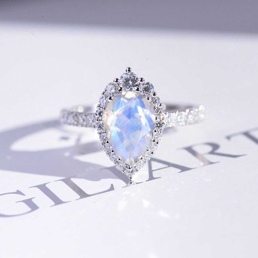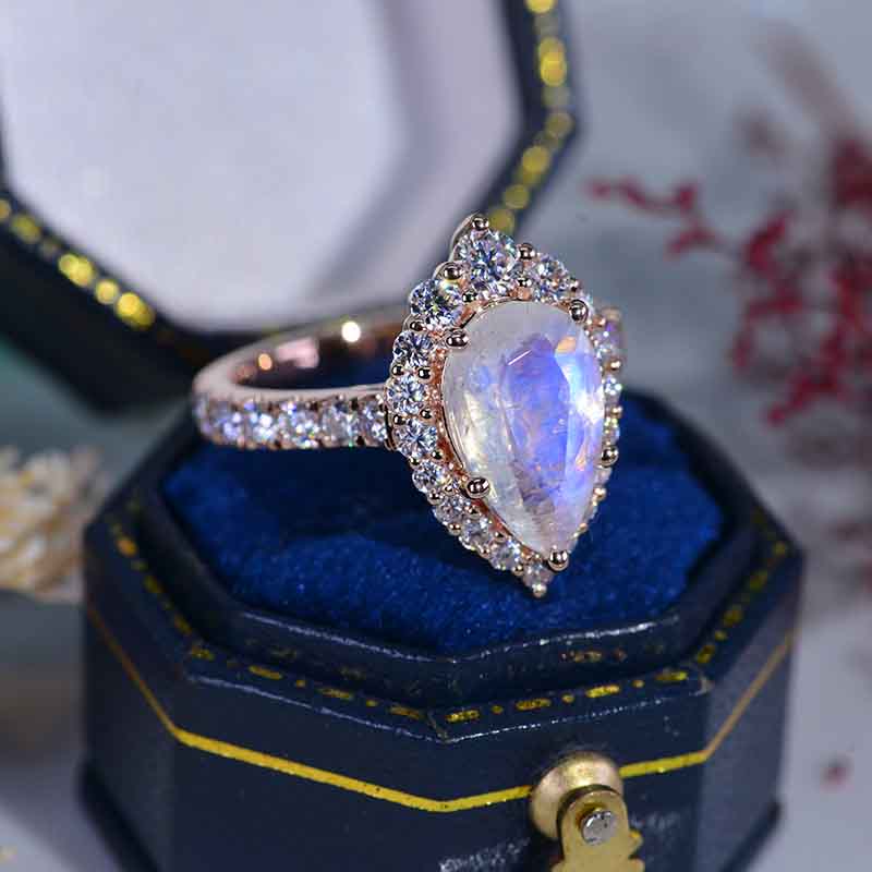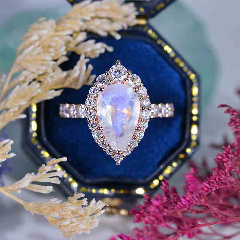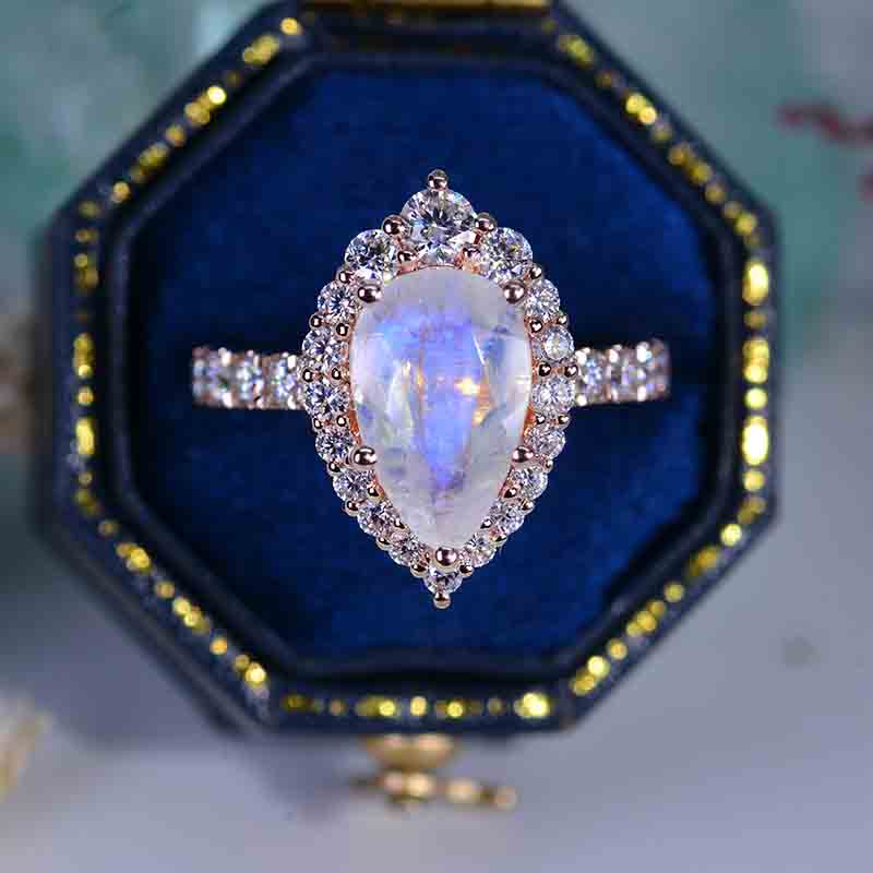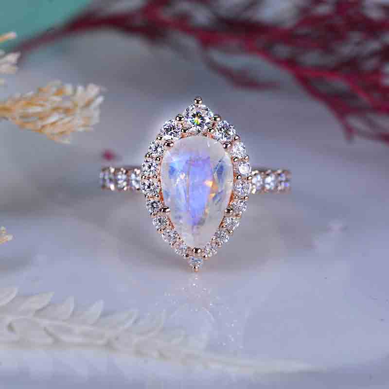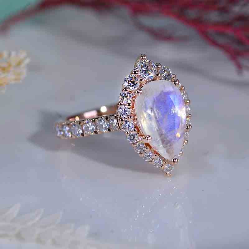 The default design option features 3 Carat 11x7mm Pear Cur Natural Moonstone Center Stone, VG-Cut, Ex-Polish, VG-Symmetry set with 0.9 TCW D-Colorless Moissanite Accent Stones