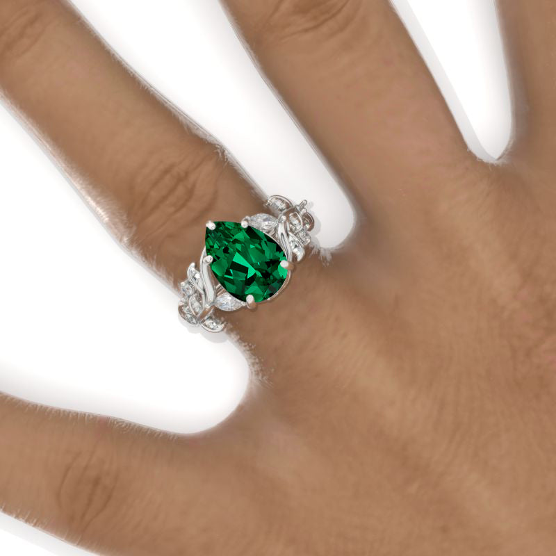 3 Carat Pear Emerald Halo Floral Engagement Ring 14K White Gold Ring Model 923-11x7mm