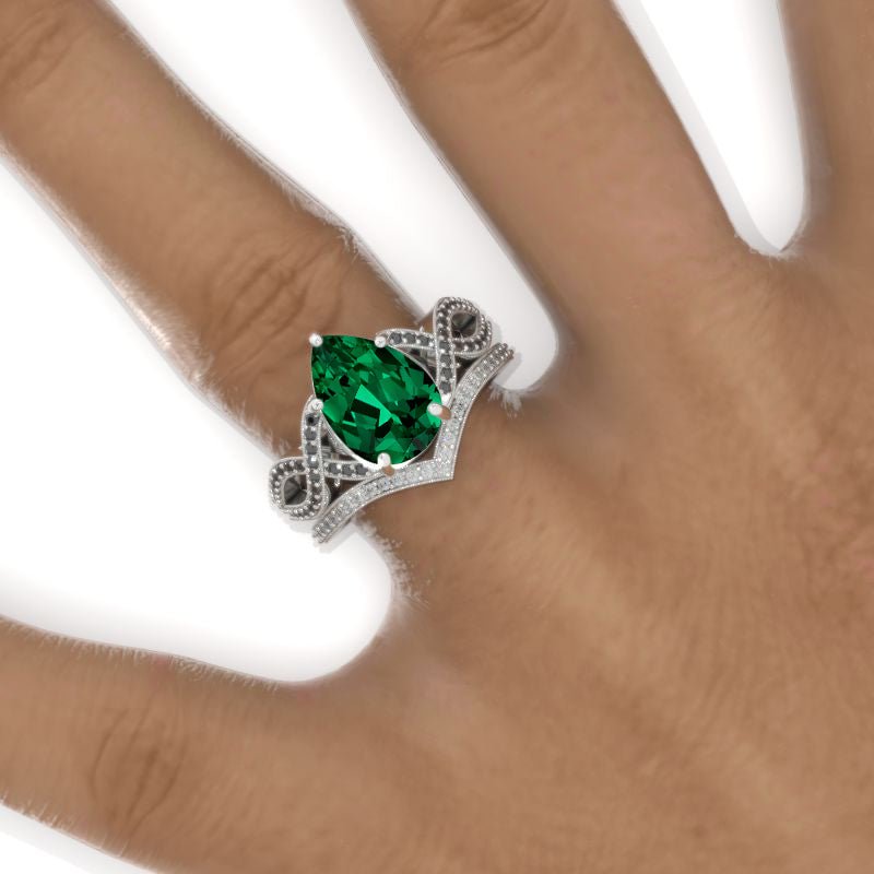 3 Carat Pear Emerald Twisted 14K White Gold Engagement Eternity Ring Set