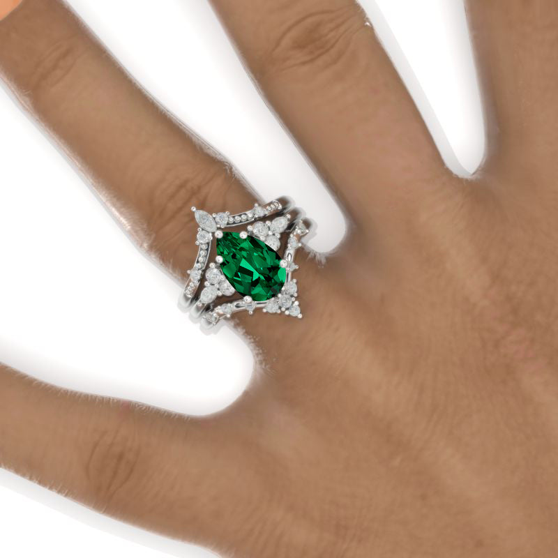 Engagement Ring : 3 Carat Ethically Lab-Grown Emerald Pear Shape 11x7mm VG-Cut, Ex-Polish, VG-Symmetry Center Stone with  Colorless 0.2 CTW Moissanite