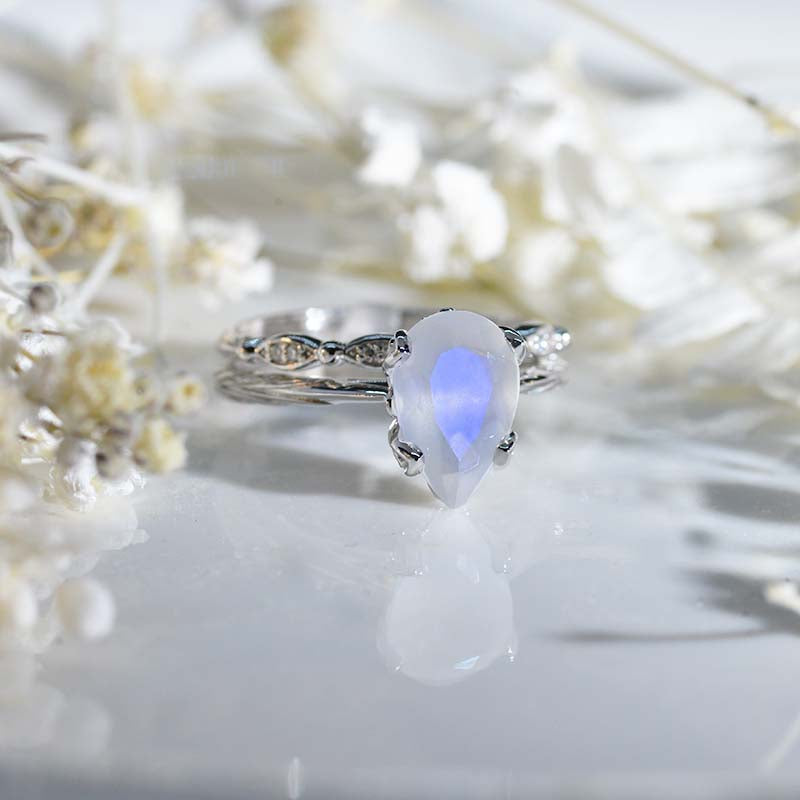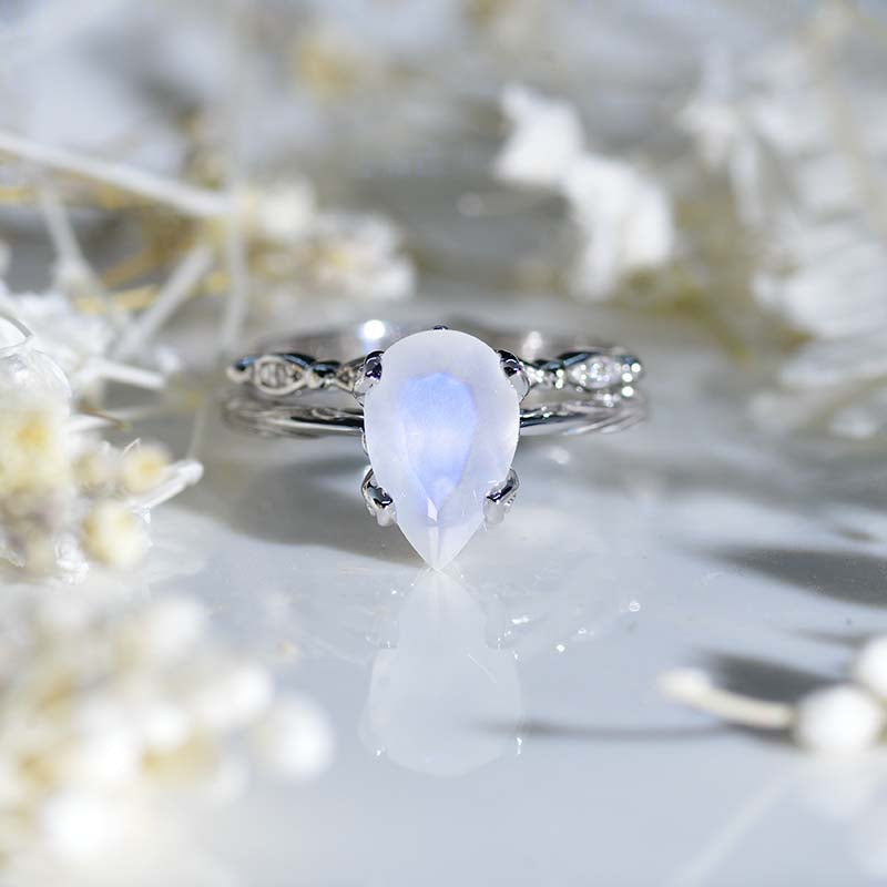 The default design option features 11x7mm Pear Cut Genuine Moonstone stone, VVS1-Clarity, VG-Cut, Ex-Polish, VG-Symmetry set with Colorless Moissanite Accents
