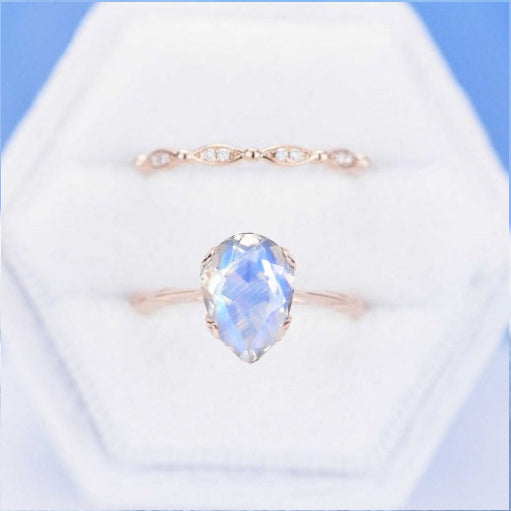 3 Carat Pear Genuine Moonstone, Genuine Moonstone 14K Rose Gold Engagement. Eternity Ring. Set of Two Rings. Leaf Floral Ring Design Ready To Ship Size 6.75