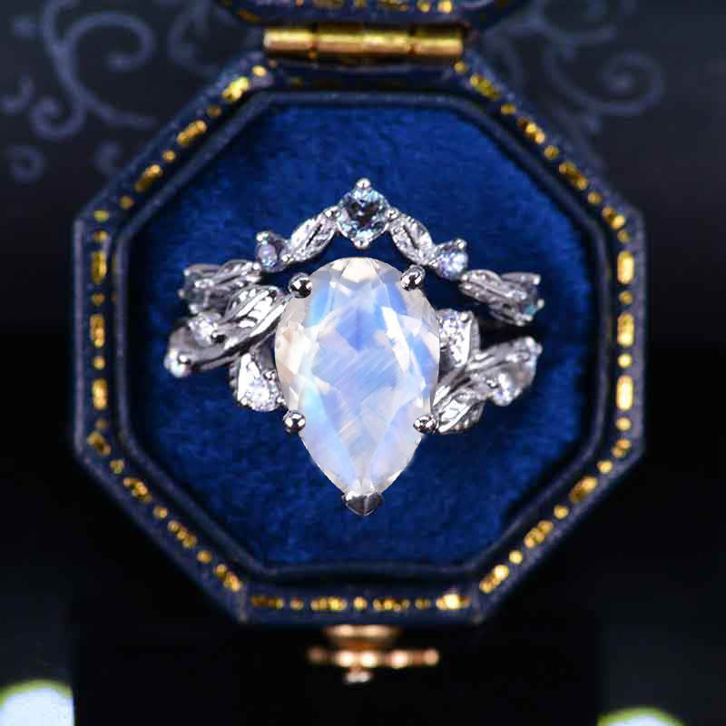 3 Carat Pear Genuine Moonstone Halo Floral Engagement Ring 14K White Gold Ring Set