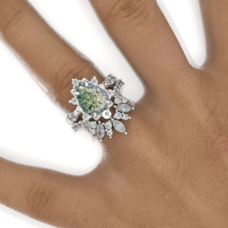 3 Carat Pear Genuine Moss Agate Halo Floral Engagement Ring 14K White - Giliarto