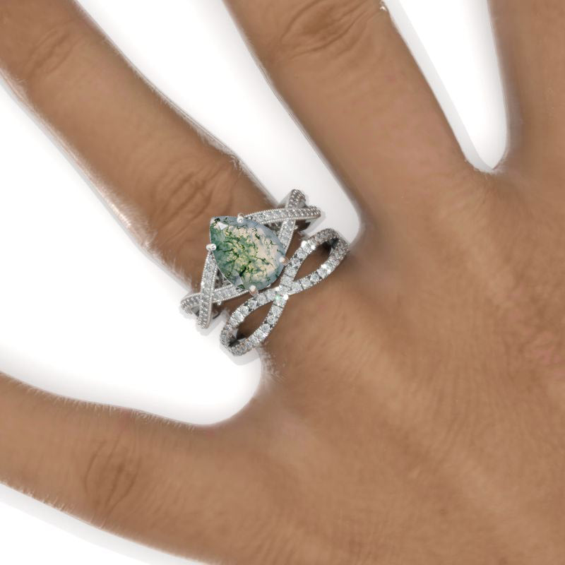 3 Carat Pear Genuine Moss Agate Halo Twisted Engagement Ring 14K White Gold Ring Set Model 966-11x7
