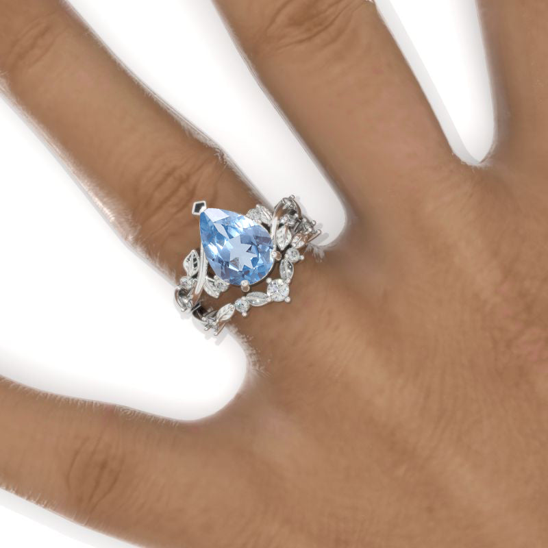 3 Carat Pear Genuine Natural Aquamarine Halo Floral Engagement Ring 14K White Gold Ring Set