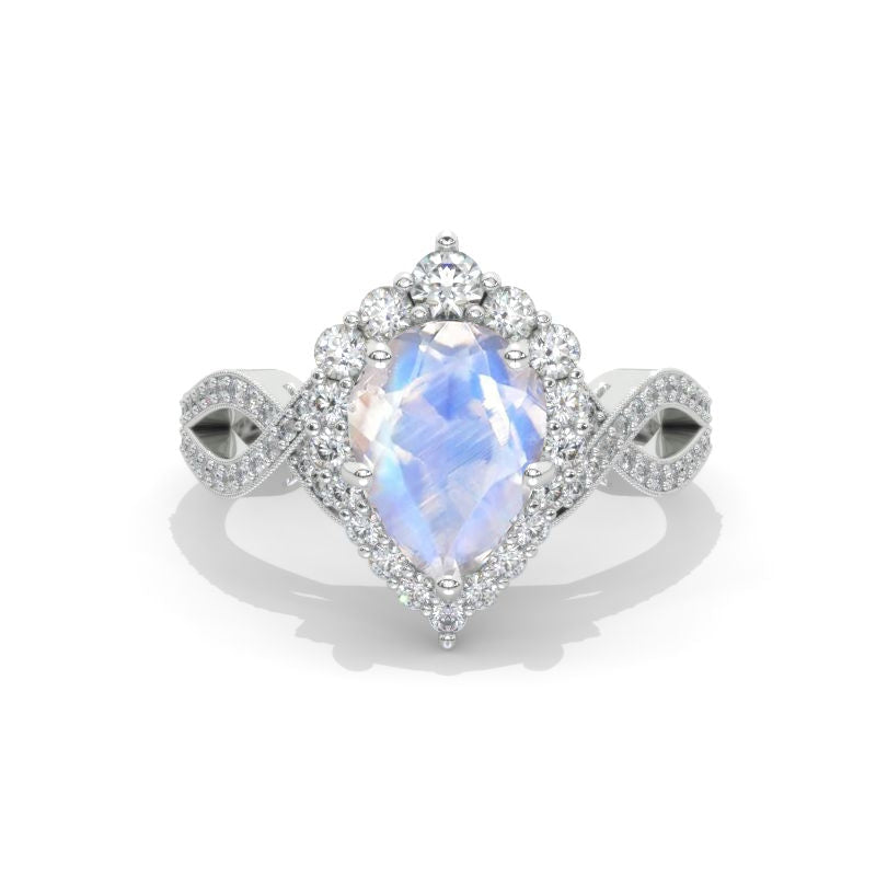3 Carat Pear Genuine Natural Moonstone Twisted 14K White Gold Engageme - Giliarto