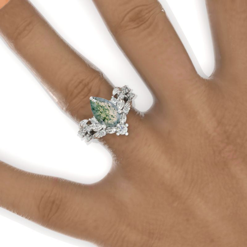 3 Carat Pear Halo Genuine Moss Agate Floral Engagement 14K White Gold Ring Eternity Ring Set Model 882-11x7