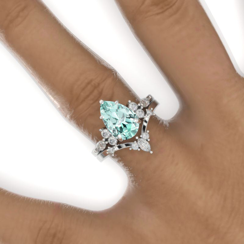 3 Carat Pear Mint Sapphire Halo 14K White Gold Engagement Eternity Ring Set