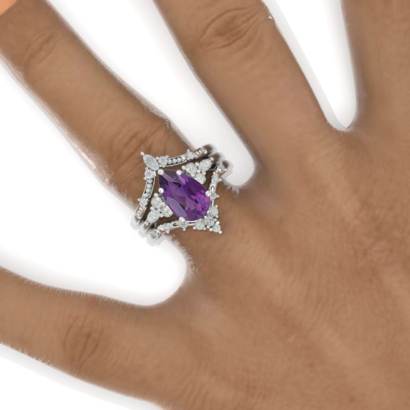 3 Carat Pear Natural Amethyst Floral Engagement 14K White Gold Ring Eternity Ring Set