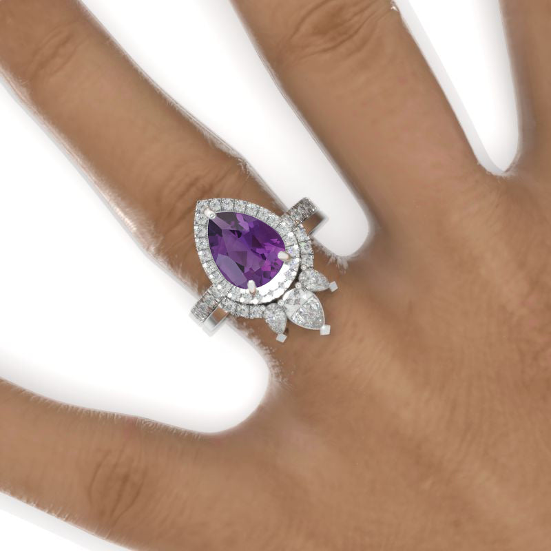 3 Carat Pear Natural Amethyst Halo Engagement Ring 14K White Gold Ring Set