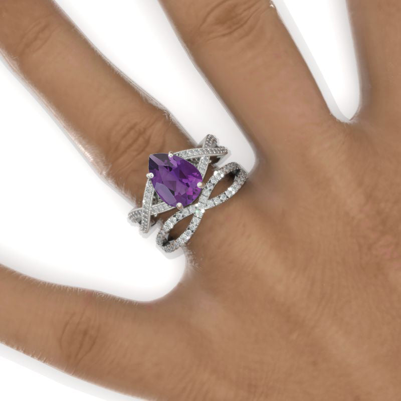 3 Carat Pear Natural Amethyst Halo Twisted Engagement Ring 14K White Gold Ring Set