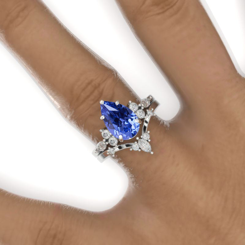 3 Carat Pear Natural Genuine Tanzanite Halo 14K White Gold Engagement Eternity Ring Set