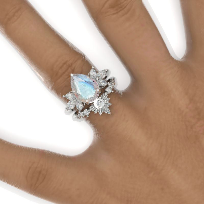 3 Carat Pear Natural Labradorite Halo Floral Engagement Ring 14K White Gold Ring Set