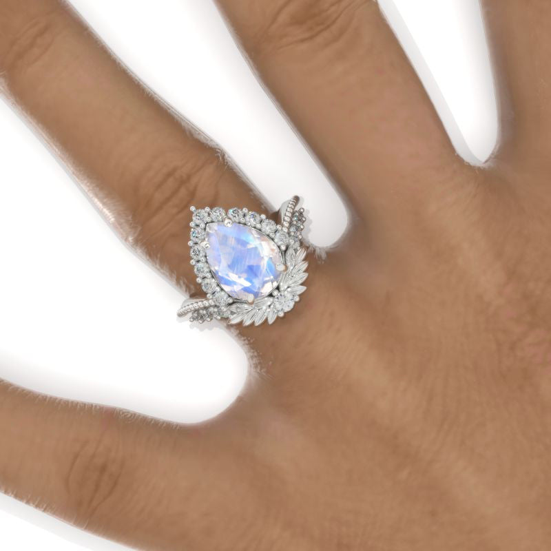 3 Carat Pear Genuine Natural Moonstone Halo Floral Engagement Ring 14K White Gold Ring