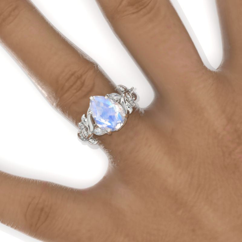 3 Carat Pear Genuine Natural Moonstone Halo Floral Engagement Ring 14K White Gold Ring
